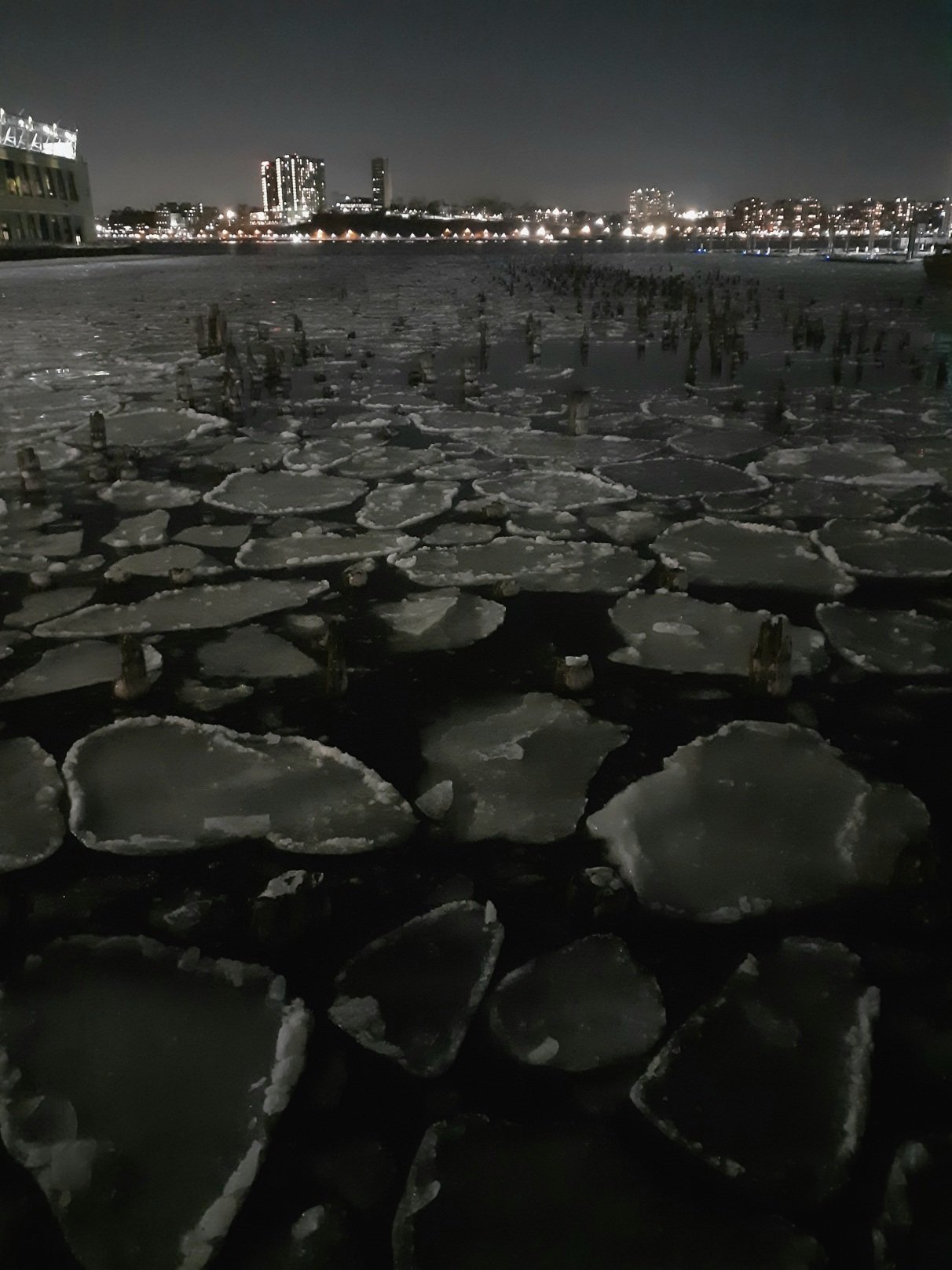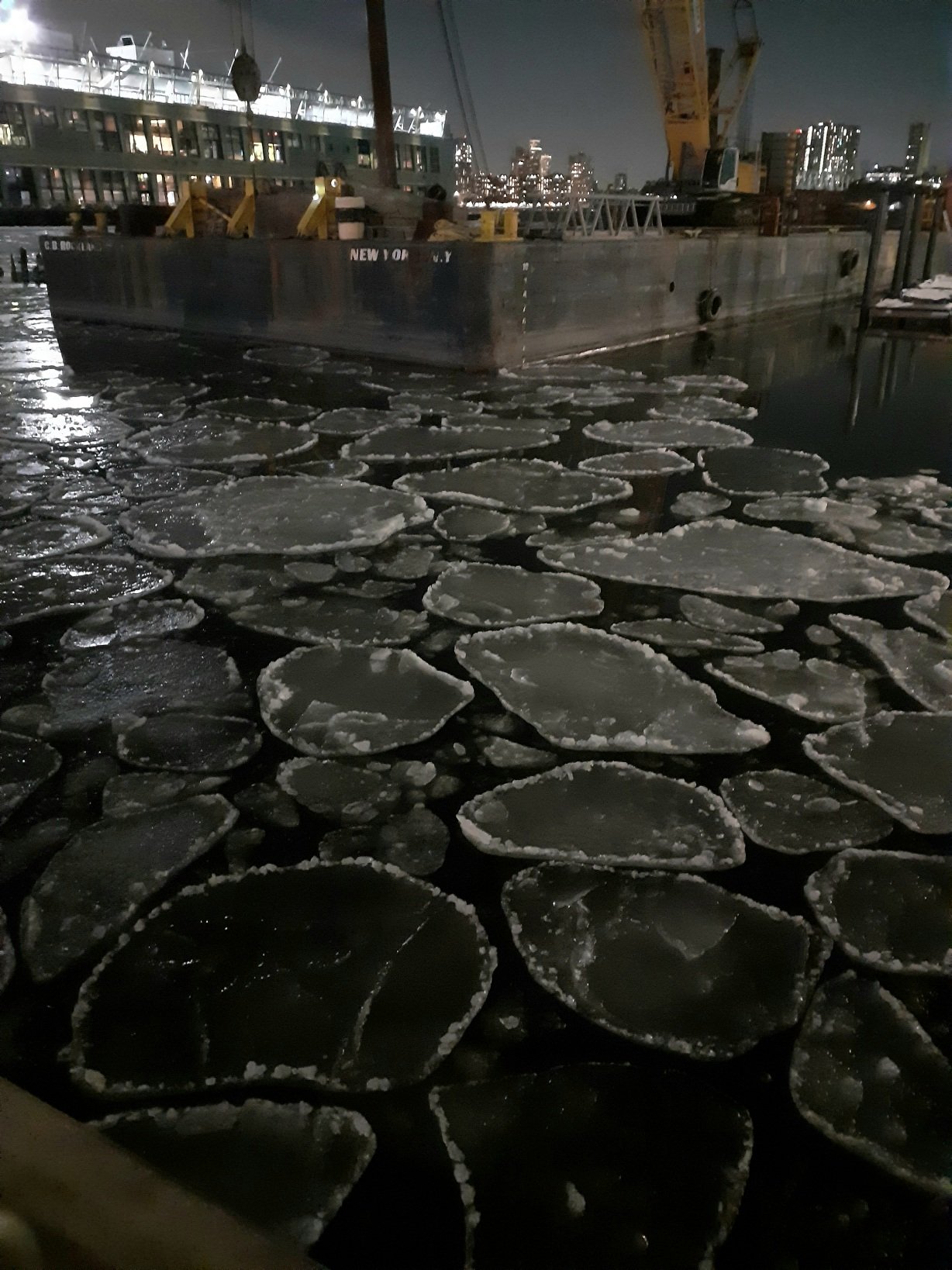 Standing there watching it in the dark I imagined this might be what it feels like to be in Antarctica surrounded by ice, except the pieces might be larger. The glowing green lights that look like the Northern Lights are from the golf range at the Chelsea Piers Sports Complex.