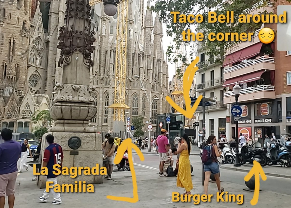 I didn’t get as settled in this week as I’d hoped. Ended up staying in 3 different hotels in 5 days, by choice. The first one, near La Sagrada Familia was WAY TOO touristy for me. I like to stay in places where there is no KFC, Taco Bell, or Burger King, all of which were across the street from The Basilica La Sagrada Familia. I get that it’s appealing to tourists (and not just American tourists). But kind of disappointing to see those while seeing one of the most amazing landmarks in the world. And I don’t mind the American presence. But why the American presence of junk food?